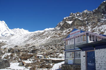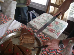 | 長いトレッキングルートの中でショートケーキが買えるのは多分ここだけでしょうし、その上ここに来た日がたまたま私の誕生日だったので同行の皆様に祝っていただきました。 偶然が幾つも重なった思い出深い誕生日になりました。 8年前ネパールに来たときには誕生日にカラパタールに立ちましたが誕生日のことはすっかり忘れていて、このことに気づいたのは日本に帰ってからでした。 |