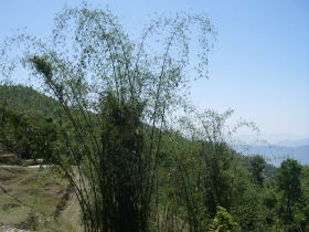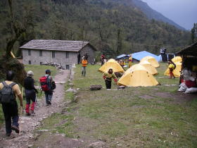 | Bamboo の Bamboo Lodge に宿泊。名前のとおり付近には竹がたくさんあり、A.B.C.付近には雪がたくさんあると聞いたガイドがストックを持っていない人に竹の杖を用意してくれました。 天気は芳しくなく、夜には雨が降り、高いところは雪だろうと心配でした。 |