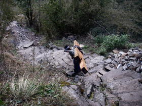 | 拡幅工事で出た岩を谷の方に放り出し、吊り橋の通路が塞がって通れそうもありません。 |