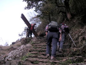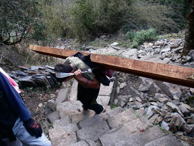 | Bamboo から Sinuwa に向かって石段の道を上ってゆくと、材木を運んでいる人たちに出会いました。聞くとM.B.C.で建築に使う木材で、1本の重さは40~45kgあるそうです。2本ずつ運んでいたので80~90kgを担い、道の狭いところではほぼ横歩きです。頭で担っているので横歩きの時は顔も横に向けていなければならず、進行方向を見るのは大変そうです。それでも右の写真のようにわれわれが石段を上り切るまで待っていてくれる余裕です。 |