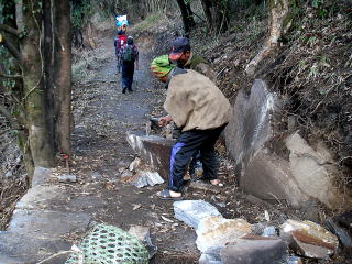 | 石段を上り切るとよく整備された道になり、そこで石を割って整備に必要なサイズにしていましたので道の整備工事は今も続いているようです。 |