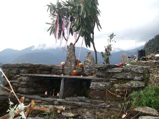 | 農家の庭先にあった祭壇のようなもの。果物が供えられ、何かを燃やした灰もあり、日常的にお参りされているようでした。 |
