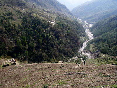 | 急な上りなので、ちょっと進んで振り返ると Jhinudanda のロッジが下に見え、高度を稼いだ感じでした。 |