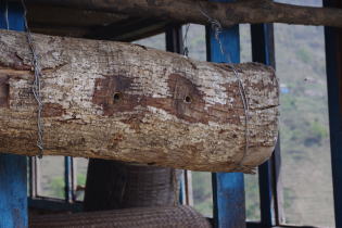 | 休憩した農家の軒下に下げてあったミツバチの巣。丸太をくり抜き、両端を泥で蓋をしたもの。中央の穴がミツバチの出入口。こういう形の巣箱をあちこちで見ました。 |
