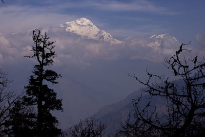 | Deurali Pass へ向かう道は樹林帯で、Dhaulagiri は木に遮られて全体はなかなか見えません。この写真はビューポイントとの案内があったところから撮りました。他ではこのようには見えませんでした。 |