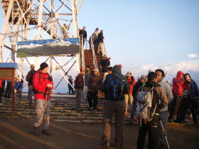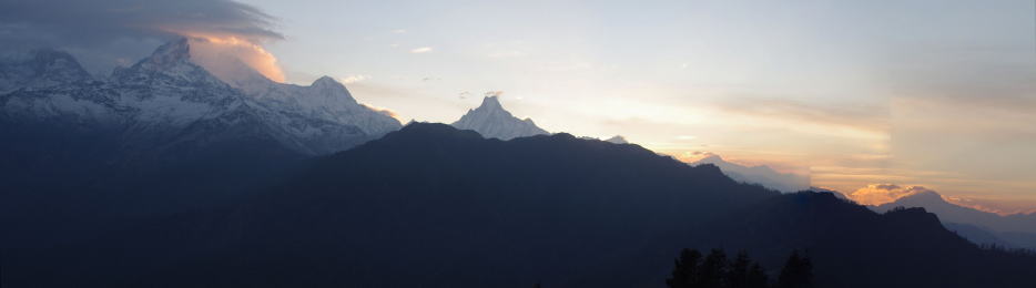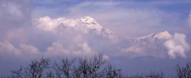| 朝日に染まる山を見ようと暗いうちにロッジを出て Poon Hill に向かいました。しかし残念ながら雲がかかり一部しか見えませんでした。特に見たかった Dhaulagiri ほとんど見えませんでした。その上、見えたところも靄がかかりだいぶ霞んでいました。 |