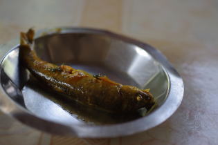 | 分岐して間もなく Matathanti Lodge に着き、休憩しました。そこで勧められて川魚の煮た物と唐揚げを食べました。どちらもカレー味でした。すぐ前に川があるのでそこでとった物のようです。 |