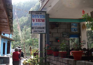 | Birethanti はロッジや店が建ち並ぶ大きな町で、写真の橋で渡った対岸にもロッジや店が並んでいました。 |