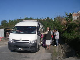 | ホテルの前で合図し、止まってくれたこのバスに乗りました。目的地の Nagdanda の少し手前で乗りたい人がいて、われわれが降りれば乗れるので降り、歩きました。 |