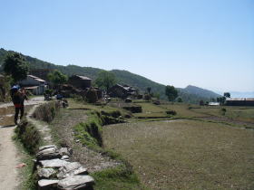 | 展望台から宿に戻り、朝食を済ませてから、もう一度展望台の下まで来て、そこから山道を辿って Phewa Tal に向かいました。 |