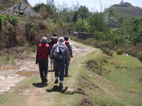 | 戻る時は途中で登ったルートから離れ、畑の縁や農家の庭先をかすめるように下り、A.B.C.に向うときに歩いた道に出ました。 |