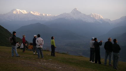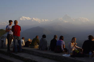 | 山に朝日が当たり始めるようすを見ようと早めに Sarangkot 展望地に行きました。この他 Dhaulagiri や Annapuruna South も見えましたがだいぶ霞んでいました。 |
