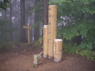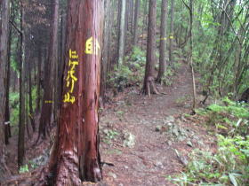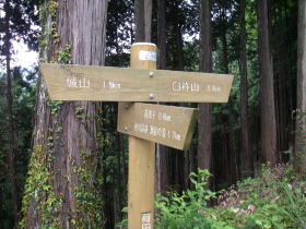 | 急な坂を登って尾根の鞍部に出たところの道標。ここまで200m程の登りでだいぶ汗をかき、ひと休み。 |