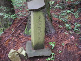 | 戸倉山茱萸御前の碑。茱萸は帰宅後調べるとグミと読むらしいが、写真に写っている2番目の文字は草かんむりに更で、違った読み方があるのかもしれません。 |