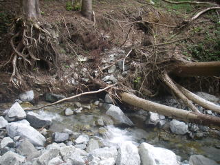 そのうち沢に向かって下り始めましたが、はっきりとした道が続くので沢に出れば林道があるだろうと高を括っていました。だが沢が近づくと急激に踏み跡は薄くなり心配になってきました。着いた所は笹子沢でした。笹子沢を下る道がないかとちょっと下って堰堤の下を覗くと両岸とも切り立っていて高巻き道があるような地形ではありません。ちょっと上流に戻り小さな赤布を見つけ尾根に取り付きました。急な斜面を必死で登り、二本杉峠から上ノ原に至る道に出た時にはホッとしました。