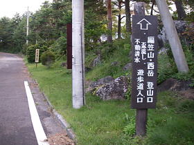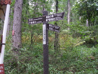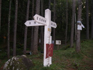 | 五叉路分岐。西岳へはここから不動清水の手前まで林道歩き。 |