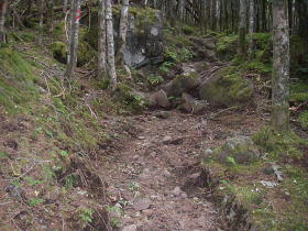 | 標高2000mを超える辺に来ると、雨が降ると水が流れるような道になり、道に岩が現れる。 |