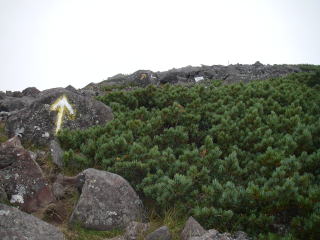 | 編笠山からの下りは大きな岩に書かれた矢印が頼りです。青年小屋に下るルートのような岩についた踏跡は殆ど無いので、濃いガスで矢印が見えなかったらお手上げでしょう。 |
