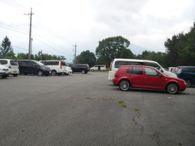 | 富士見高原GC前駐車場。朝は小学生が野外学習に出発する時だったので、多くの父兄が見送りに来ていて駐車場はとても混んでいました。昼過ぎに戻った時にはだいぶ空いていました。 |