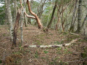 | 登山口からヤブ沢ノ頭までは、痩せ尾根の部分を除けばはっきりした踏跡の見えないルートでした。P540までのルートには人の踏跡ではなく、鹿の蹄の跡らしいものがたくさんありました。また戸沢ノ頭ではイノシシが2頭駆け回っていました。パン、パンと拍手をして遠くへ行ってもらうようにしましたが、あまり効果はありませんでした。 |