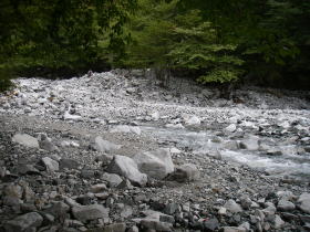 | ゴーラ沢出合。ベルクロでとめるサンダルにはきかえて渡りました。裸足だと足の裏が痛くて大変ですが、サンダルだと快適です。 |