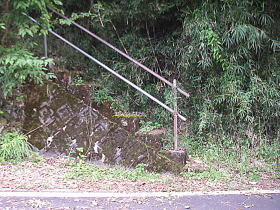 | 中川橋を渡ったところにある駐車場とその前の登山口。もちろん道標はなし。登山口の石段にはスズタケが覆いかぶさり、それを押しのけて歩き出すとザックに蔓が引っかかって進めなくなってしまった。これは大変なところに来てしまったと思ったが、少し進むとヤブは薄くなって一安心。登山口前の道路と駐車場のせいで日当たりが良く、ここだけヤブが濃くなっているようでした。 |