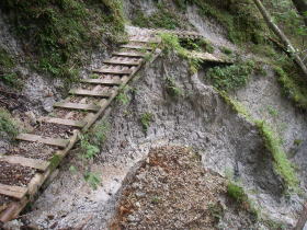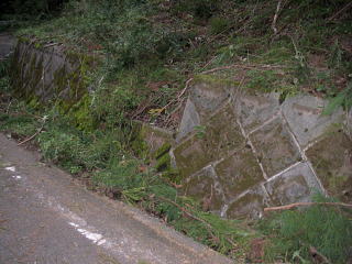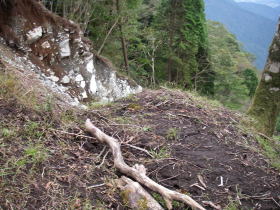 | 雨山峠から寄大橋に下る道は、このように侵食が進み危なっかしい所が何箇所もありました。 |
