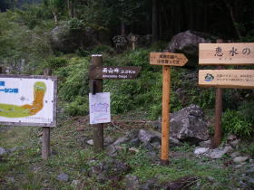 | 登山道入口 雨山峠からここまでのルートのうち雨山峠付近の沢の水量はあまり多くなく靴を濡らさずに歩くことが出来ましたが。寄沢は以前通った時より水量が多く渡渉に手間取る所がありました。 |