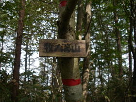 | 牧ノ沢山 まったく山頂らしくない地形で、赤布がいくつもあったのでバリエーションルートの分岐かと思いましたが近くに踏み跡らしきものはありませんでした。よく見るとこの標示がありました。 |