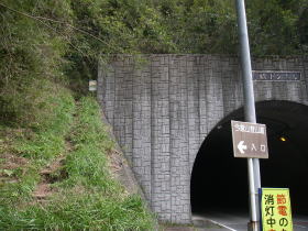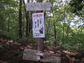 | トンネルの道志村側の登山口への分岐らしき地点の道標。急斜面に赤布が点々とある道が見えました。 |