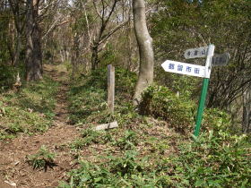 | 今倉山と御正体山を結ぶ尾根の稜線に出たところ。登山口へは都留市街と書いてあります。 |