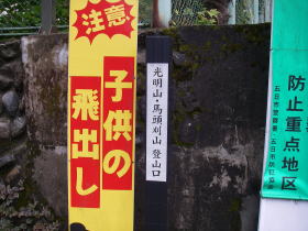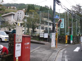 | 軍道バス停。ハイキング用の道標を探してみると、曲がり角に『光明山・馬頭刈山登山口』と書いた小さな道標がありました。 |