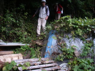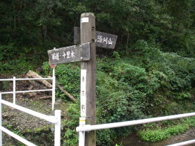 | 山道への入口の道標。道標の下の沢には魚が何匹も見えました。 |