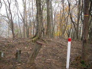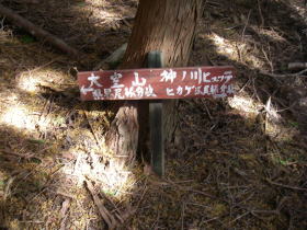 | 神ノ川ヒュッテ分岐 当初の予定では大室山に行ってくるつもりでしたが、朝ルートを探すとき堰堤工事にともなって山の斜面にとても高い擁壁ができていましたので、下るルートが擁壁の上に出てしまうと、日陰沢に下るのに相当手間取ると思って、大室山を割愛して下山することにしました。 |