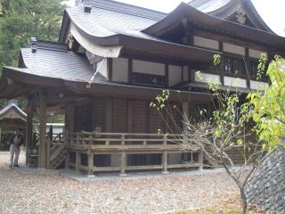 | 大嵐天神社。社の竣工記念の太宰府天満宮の梅の木がありました。挿し木などで増やしたものでしょうが枯れているように見えました。 |