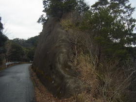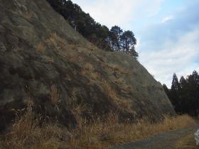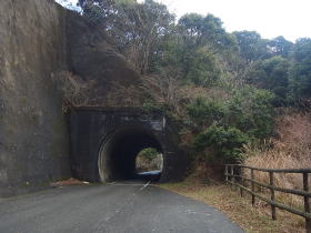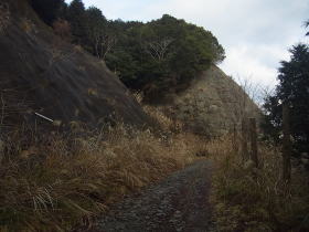 | トンネルをくぐって更に高山を巻くように林道を辿り山頂へに道を探しましたがモルタルを貼りつけた高い壁が続き見当たりません。 |