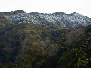 | じがい水付近から烏場山の方を見ると、木の葉に雪がついて白く見えました。 |