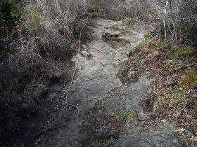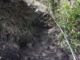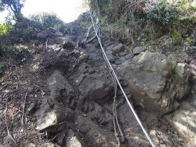 | 休憩用の東屋のある展望台を過ぎると、山頂まではロープや鎖のある急坂です。このロープや鎖が伊予ヶ岳の特徴になっているようです。 |