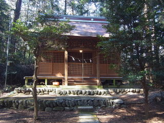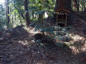 | 鞍部から社のある峰までは手すりのある階段が続いていました。左から上がってきている道はこの社の参詣道のようです。社の中を覗くと『金太郎大権現』などの名前があり、外の石碑にもいろいろな神様の名前がありました。いろいろな神様が合祀されているようです。 |