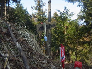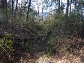 | 仙洞寺山の山頂付近の下りは非常に踏跡が薄く、迷子になりそうで必死に赤布を探しながら下りました。赤布といっても色褪せたせいでしょうか実際は白布でしたがとても助かりました。 P415では赤布で指示されている方向が2つあり、1つは三角山に向かいもう1つは南東方向の尾根に向かっているようでした。三角山に向かいましたが、その下りは土の道にしては驚くほど急でした。次の峰との鞍部に着くと左から道が上がってきていました。 |