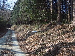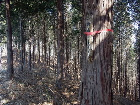 | 林道を進むと山道に入りそうな地形で赤布があったので入ってみましたが、少し進むと林道に下りてしまいました。 |