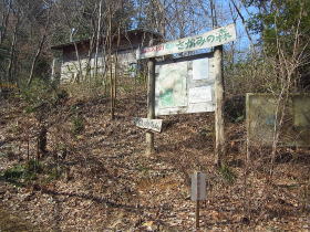 | 林道の分岐を右に進むと、林道が広くなっているところがあり、ベンチ、テーブル、テント、小屋などがあり『フォレスト21 さがみの森』という看板と仙洞寺山を示す道標もありました。小屋の前には『中道』『西尾根道』と書いた道標があり、西尾根道を進みました。 |