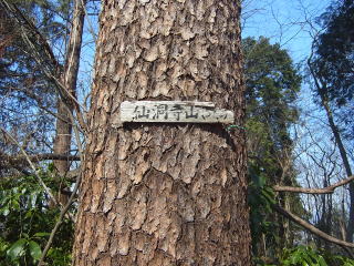 | 仙洞寺山。緑のテープで強調した山名表示とちょっと古い板の表示がありました。周りは樹木に覆われ展望はありません。まだヒルは大丈夫だと思い、この倒れた丸太に座って昼食をとりました。 |