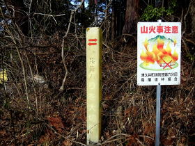 | 山道入口の茨菰山と書いてある杭。色褪せた杭に茨菰山と書き加えたものです。 |