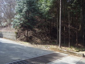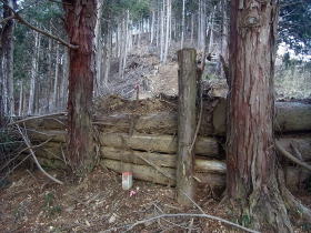 | 鉄塔の後ろにはこの土留めがあり、その先は林道のような道で、山頂まで達していました。 |
