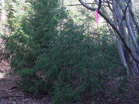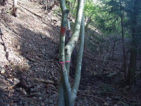 | 左の赤布の近くにあった正面の斜面を登るように指示しているらしい赤ペイントの矢印。 |
