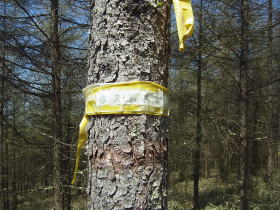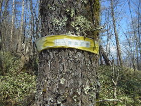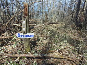 | 林道から源次郎岳への分岐には赤布と源次郎岳と書いた道標がありました。 |