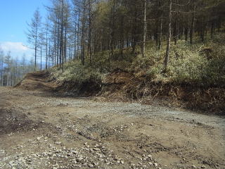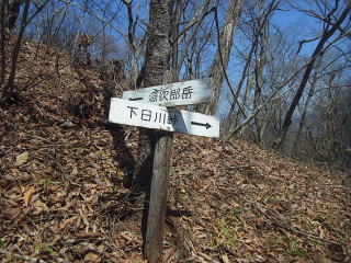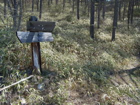 | 分岐をちょっと下ると林道の拡幅工事をやっているような所に出ました。林道に下って左にちょっと進むとこの源次郎岳と書いた道標のある分岐がありました。この辺りが下日川峠のようです。 |
