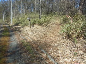 | 林道を10分ほど進んだところの分岐。赤布があり、ここが中日川峠のようです。 |