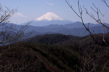 | 分岐から源次郎岳の向かう途中で樹間に見えた富士山。木に遮られ富士山全体が見える所は少ない。 |
